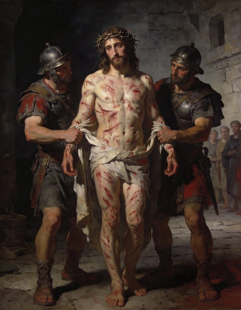 Když přichází nepřátelé, dobrovolně se jim vydává. Odchází s nimi. Nechává se věznit, bít, poplivat. Dnešní den, nikomu nic neodpírá, ani dobrým ani zlým lidem. Nechává se vyslýchat jedním veleknězem, druhým veleknězem, nechává se soudit jedním panovníkem, druhým panovníkem. Nechává se bičovat dle libosti, vysmívat a trním korunovat dle libosti. Nikomu nic dnes neodpírá!